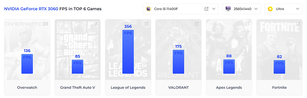 For instance, using nVidia GeForce RTX 3060 mid-range graphics card + Intel i5 11th Gen CPU, howmanyfps.com estimates the following fps: